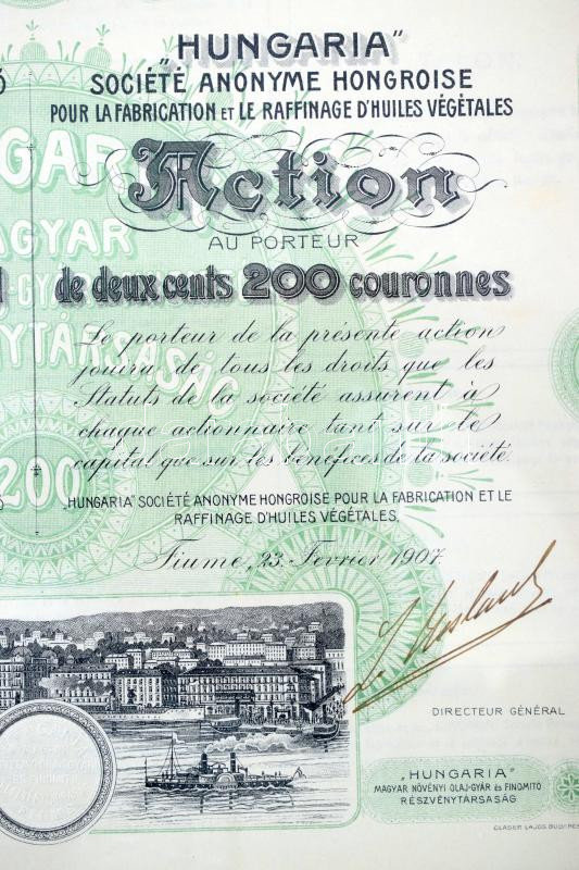 Hungary / Fiume 1907. "'Hungaria' societe anonyme hongroise pour la fabrication et le raffinage d'huiles vegetales" (Hungarian Vegetable Oil Factory and Refining Joint Stock Company) share about 200 Corone in Hungarian and French, with embossed stamp, in frame C:XF