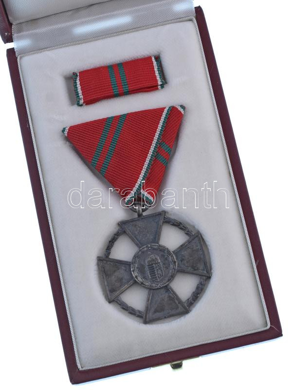 Hungary 1991. "Silver Cross of Merit of the Hungarian Republic, Military Grade" silver plated bronze decoration with ribbon and miniature ribbon, in decorative case C:AU patina