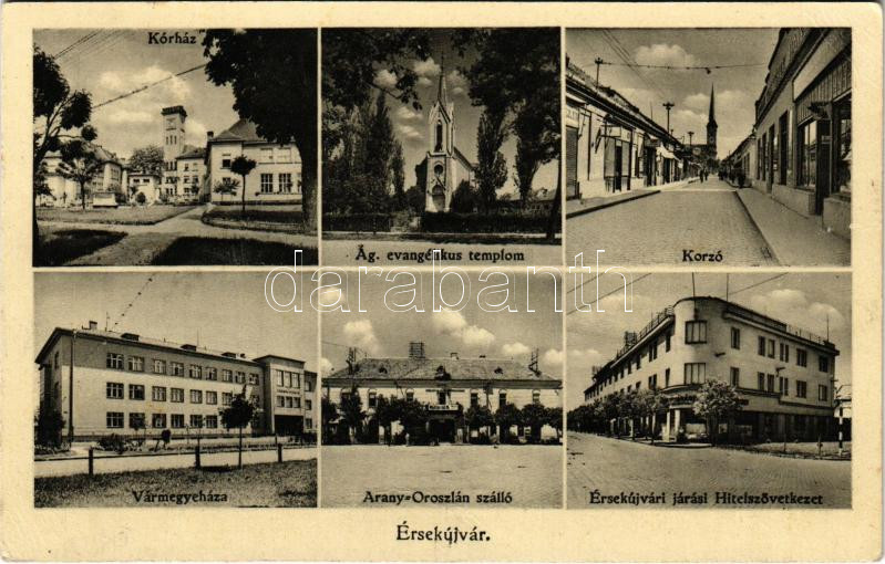 1940 Érsekújvár, Nové Zámky; kórház, korzó, ágostai evangélikus templom, vármegyeháza, Járási Hitelszövetkezet, Arany Oroszlán szálló / hospital, street, church, county hall, credit union, hotel (EK)