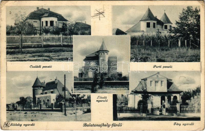 Beschreibung: 1939 Balatonújhely (Siófok), Családi és Parti penzió, Siklaky, László és Téry nyaraló (EK)