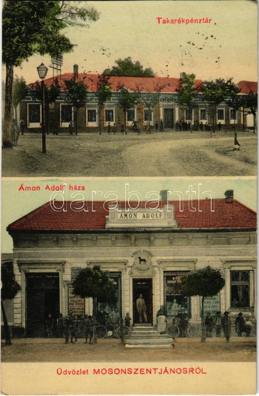 Mosonszentjános, Jánossomorja; Takarékpénztár, Ámon Adolf üzlete https://www.darabanth.com/de/460-Fernauktion/460.0/Ansichtskarten/Ungarn~1500005/Mosonszentjanos-Janossomorja-Takarekpenztar-Amon-Adolf-uzlete~II3085741