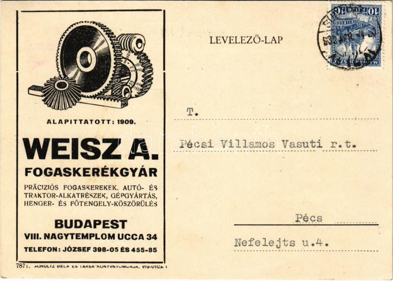 1932 Weisz A. fogaskerékgyár reklámja. Budapest VIII. Nagytemplom utca... https://www.darabanth.com/de/460-Fernauktion/460.0/Ansichtskarten/Werbungen~1500071/1932-Weisz-A-fogaskerekgyar-reklamja-Budapest-VIII-Nagytemplom-utca-34-Schultz-Bela-es-tarsa~II3085449