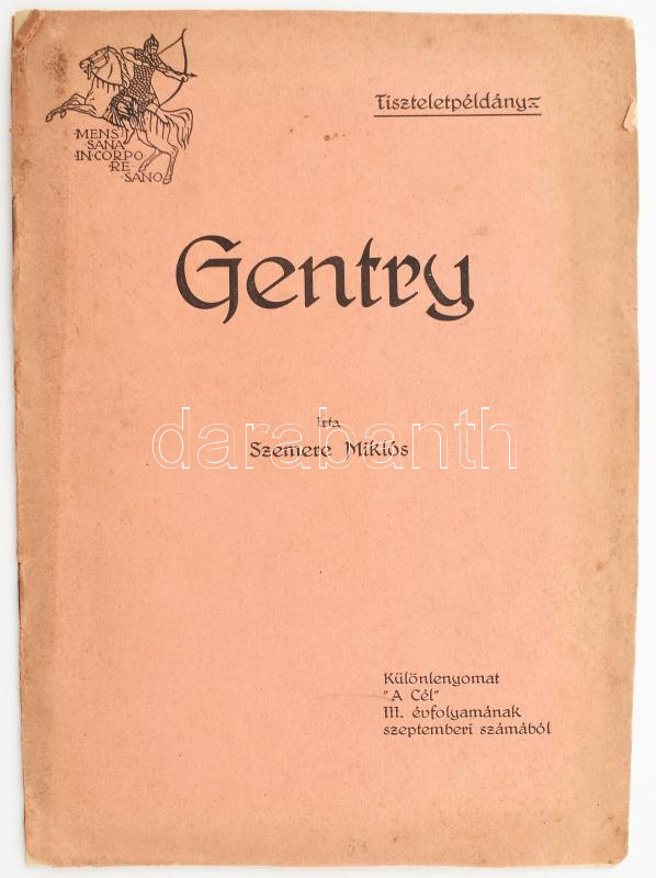 1912 Szemere Miklós: Gentry. Különlenyomat "A Cél" III. évfolyamának szeptemberi számából. "Tiszteletpéldány" felirattal a borítón. Bp., 1912, "Élet", 7 p. Kiadói papírkötés, szakadt borítóval. Szemere Miklós (1856-1919) politikus, diplomata, országgyűlési képviselő, jogász, író, lótenyésztő, a századforduló közéletének jellegzetes alakja.