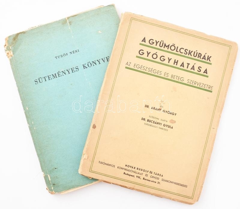 Arany György: A gyümölcskúrák gyógyhatása az egészséges és beteg szervezetre. Bucsányi Gyula előszavával. Bp.,[1940],Novák Rudolf, 48 p. Első kiadás. Kiadói papírkötés, sérült borítóval. + Turós Lukácsné: Turós néni süteményes könyve. Bp., 1962, Minerva. Kiadói papírkötés, sérült gerinccel, foltos borítóval, a borítón törésnyommal.