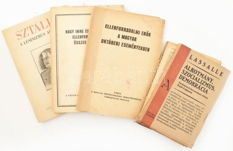 4 darab kommunista könyv: A leninizmus alapjai, Nagy Imre és bűntársai ellenforradalmi összeesküvése, Ellenforradalmi erők a magyar októberi eseményekben, Alkotmány, szocializmus, demokrácia. Papírkötés, sérülésekkel.
