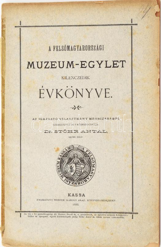 A Felső-Magyarországi Múzeum-Egylet kilenczedik évkönyve. Szerk. Dr. Stöhr Antal. Kassa, 1888. Kosch és Scharf. 64 + 6 p. Kiadói papírkötésben Benne Esterházy nádor leveleiről szóló cikk