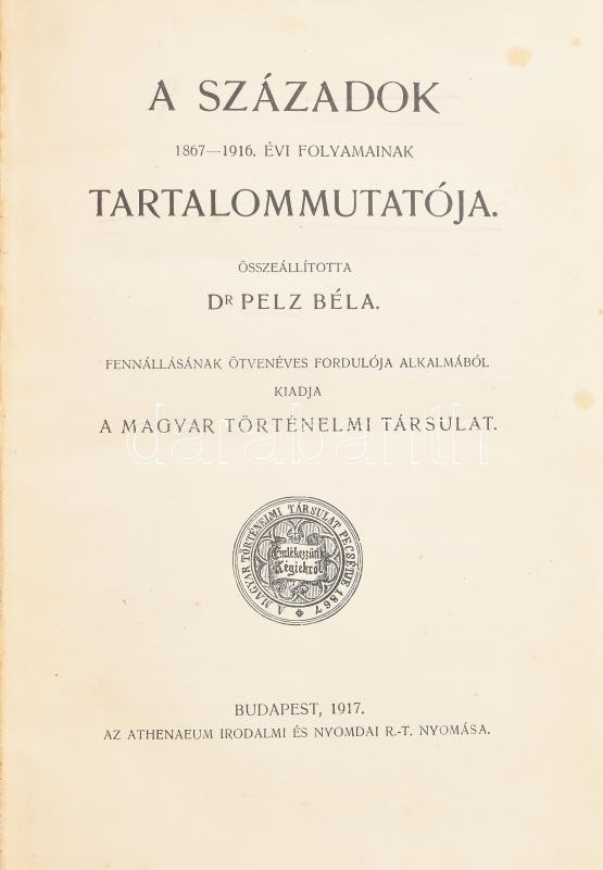 A Századok 1867-1916. évi folyamainak tartalommutatója. Összeáll.: Dr. Pelcz Béla. Bp., 1917, MTA,(Athenaeum-ny.), 4+195 p. Átkötött félvászon-kötés, kissé kopott borítóval, ceruzás aláhúzásokkal, bejelölésekkel, az 1/2. oldal kétszer van meg.