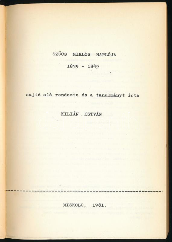 Szűcs Miklós naplója 1839-1849. Sajtó alá rendezte és a tanulmányt írta: Kilián István. Miskolc, 1981, Miskolci Városi Könyvtár - Herman Ottó Múzeum. Kiadói papírkötés.