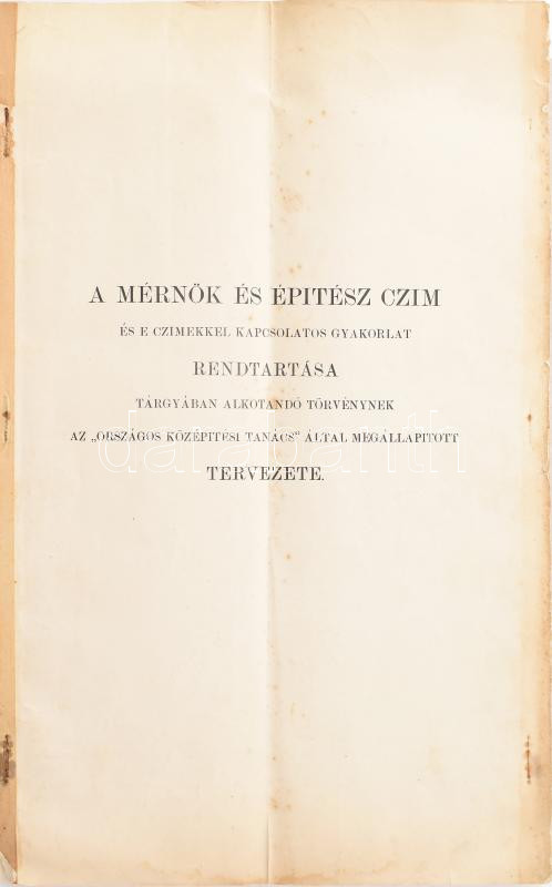 cca 1886-1900 A mérnök és építész czím és czímekkel kapcsolatos gyakorlat rendtartása tárgyában alkotandó törvényeknek az "Országos Középítési Tanács" által megállapított tervezte. Bp., Athenaeum-ny., hajtásnyommal, az első és az utolsó lap foltos, kissé szakadt, a gerinc sérült, kissé hiányos, ceruzás bejegyzésekkel, 37+3 p.