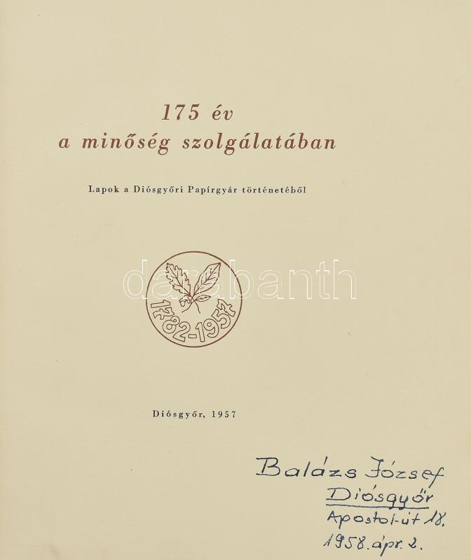 175 év a minőség szolgálatában. Lapok a Diósgyőri Papírgyár történetéb... https://www.darabanth.com/de/460-Fernauktion/460.0/Bucher/Bucher-Reise-und-Ortgeschichte~1000035/175-ev-a-minoseg-szolgalataban-Lapok-a-Diosgyori-Papirgyar-tortenetebol-Diosgyor-1957-Kn~II3086273