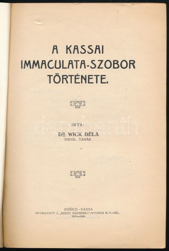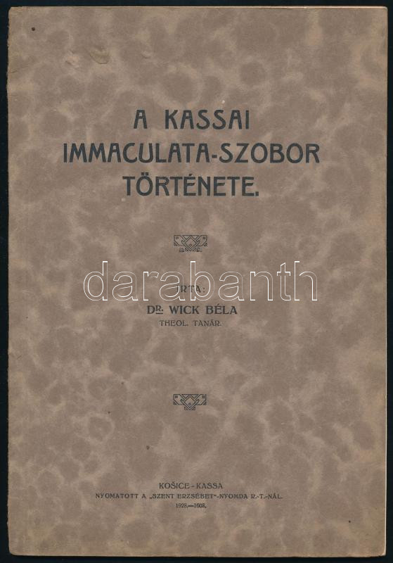 Dr. Wick Béla: A kassai Immaculata-szobor története. Kassa, 1928, "Sze... https://www.darabanth.com/de/460-Fernauktion/460.0/Bucher/Bucher-Reise-und-Ortgeschichte~1000035/Dr-Wick-Bela-A-kassai-Immaculata-szobor-tortenete-Kassa-1928-Szent-Erzsebet-ny-1-tplus~II3079054
