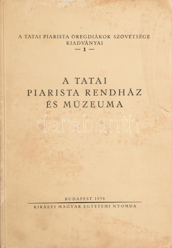 [Révhelyi Elemér]: A tatai piarista rendház és múzeuma. A Tatai Piarista Öregdiákok Szövetsége kiadványai 1. Bp., 1938, Kir. M. Egyetemi Nyomda, 58+2 p.+XXXI t. Kiadói papírkötés, kissé sérült, foltos borítóval.