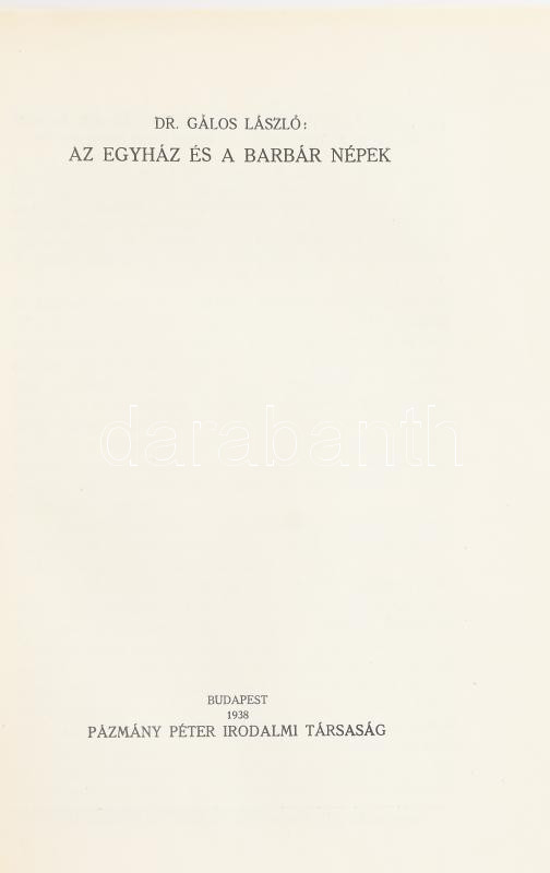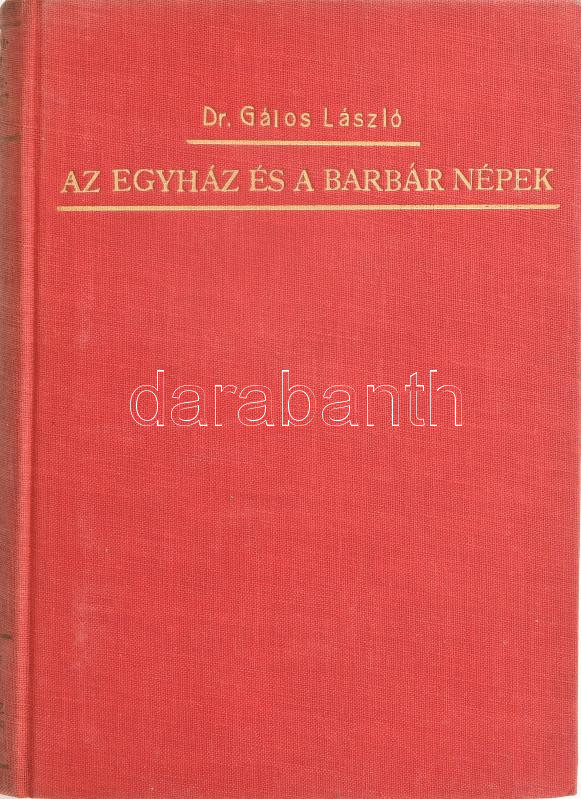 Dr. Gálos László: Az egyház és a barbár népek. A keresztény egyház története III. köt. Bp., 1938, Pázmány Péter Irodalmi Társaság, 320 p. Kiadói egészvászon-kötés, kissé fakó gerinccel.