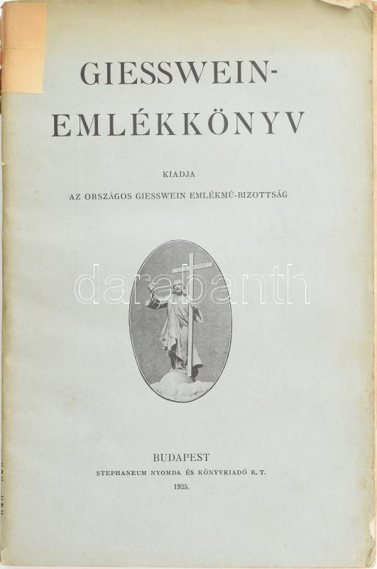 Giesswein-emlékkönyv. Kiadja az Országos Giesswein Emlékmű-Bizottság. Bp.,1925, Stephaneum, 4+246+2 p. Kiadói szakadt papÃrkötésben. Giesswein Sándor (1856-1923) pápai prelátus, keresztényszocialista politikus, országgyűlési képviselÅ‘, Ãró, társadalomtudós, MTA tag, Szent István Akadémia elnöke (1916-1921), a Magyar Országos Eszperantó Egyesület elnöke (1911-1923).