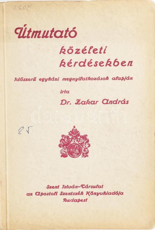 Zakar András: Útmutató közéleti kérdésekben. Időszerű egyházi megnyilvánulások alapján. Bp., 1947, Szent István Társulat. 55 p. Kiadói papírkötés, borítón és néhány kevés lapon tollas jelölésekkel.