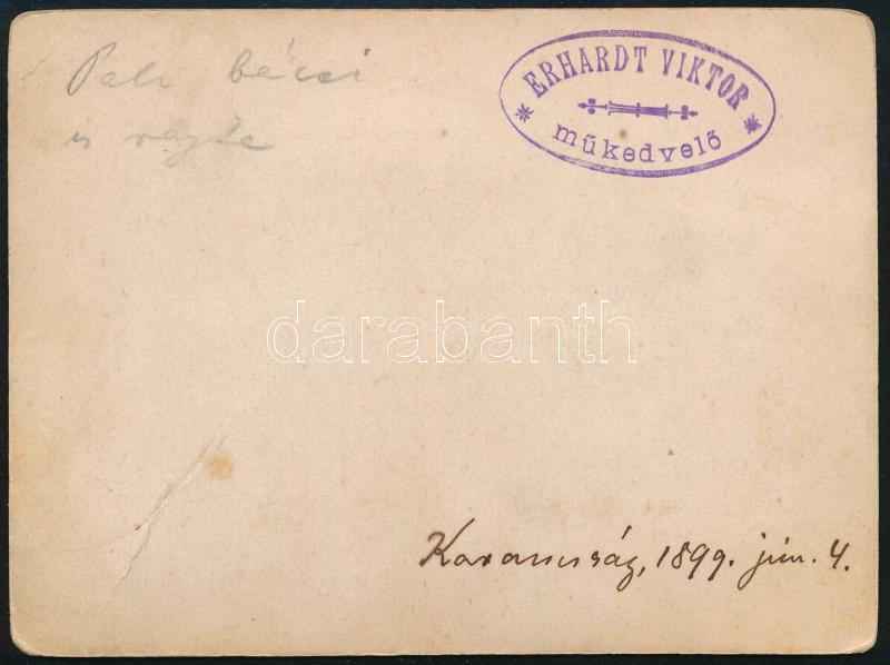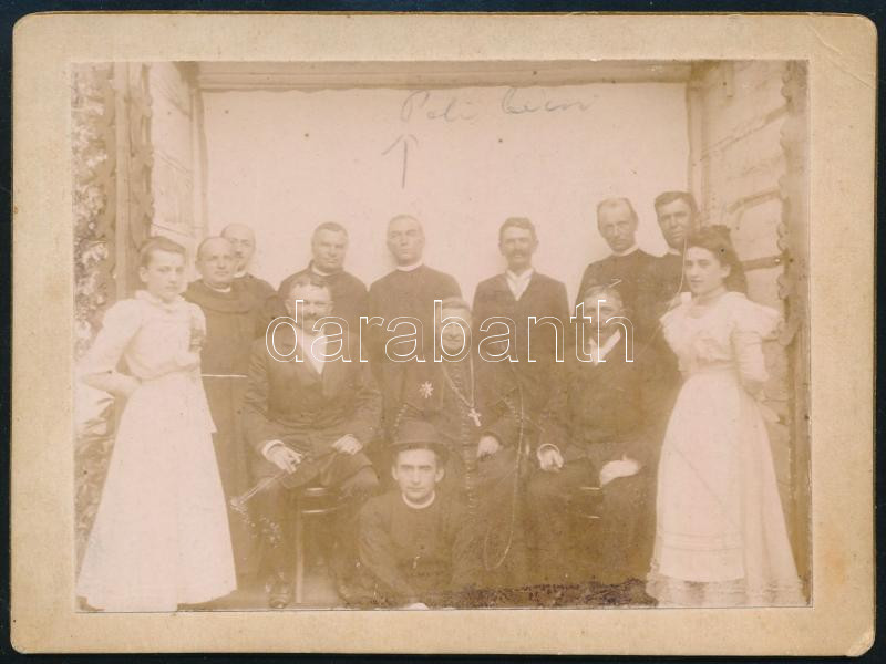 Beschreibung: 1899 Karancsság, társaság püspökkel, keményhátú fotó Erhardt Viktor műterméből, 9,5×12,5 cm
