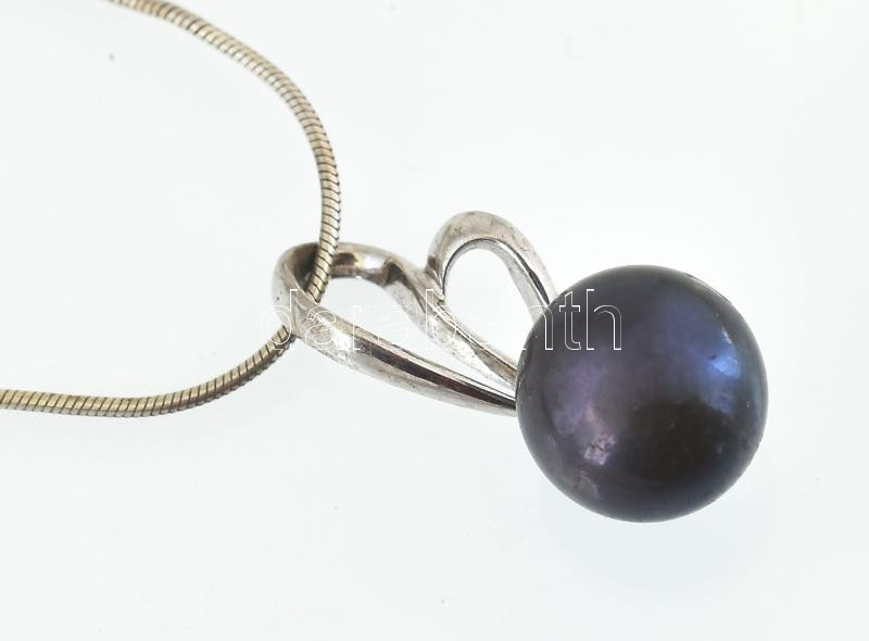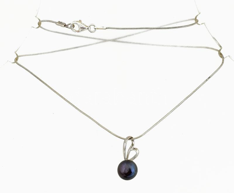 Beschreibung: Ezüst(Ag) nyaklánc fekete tenyésztett gyöngy medállal, jelzett, h: 38 cm, bruttó: 3,8 g