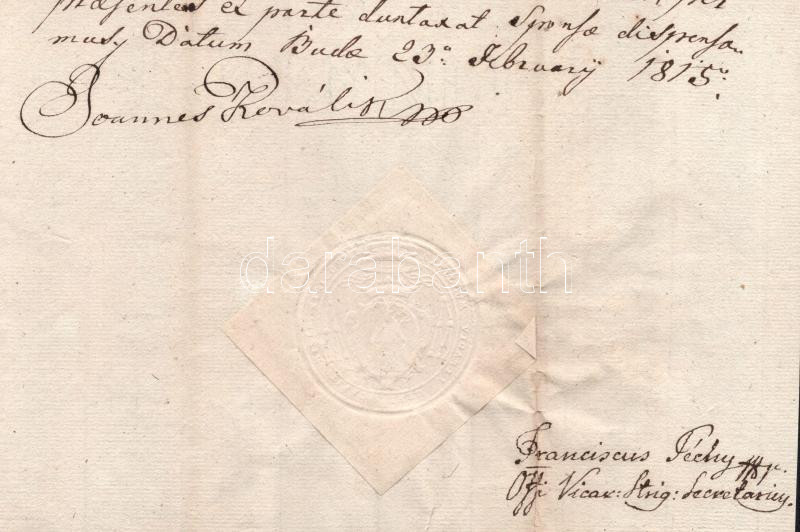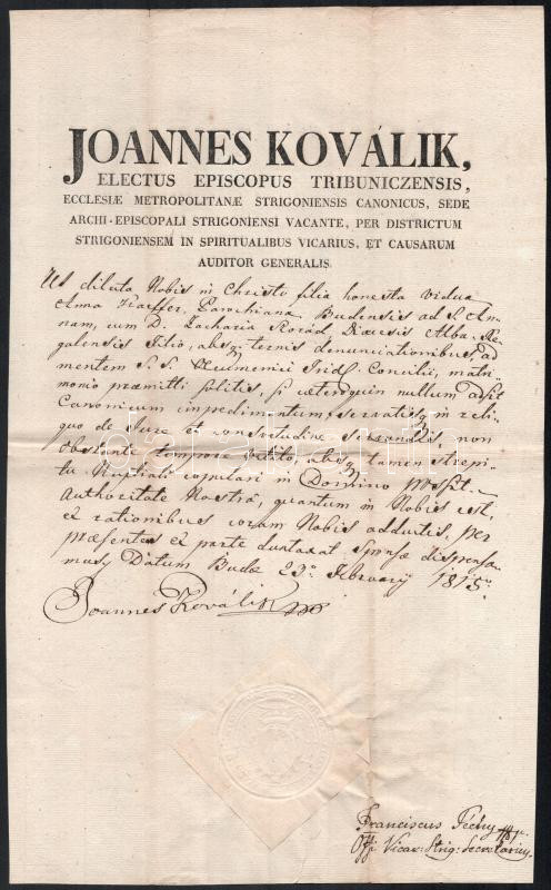 1815 Kovalik János (1770-1821) tribunici választott püspök által kiado... https://www.darabanth.com/de/460-Fernauktion/460.0/Kunst-Dokumente-andere-Sammelgebiete/Dokument~500020/1815-Kovalik-Janos-1770-1821-tribunici-valasztott-puspok-altal-kiadott-okirat-autograf~II3087620