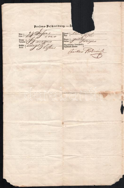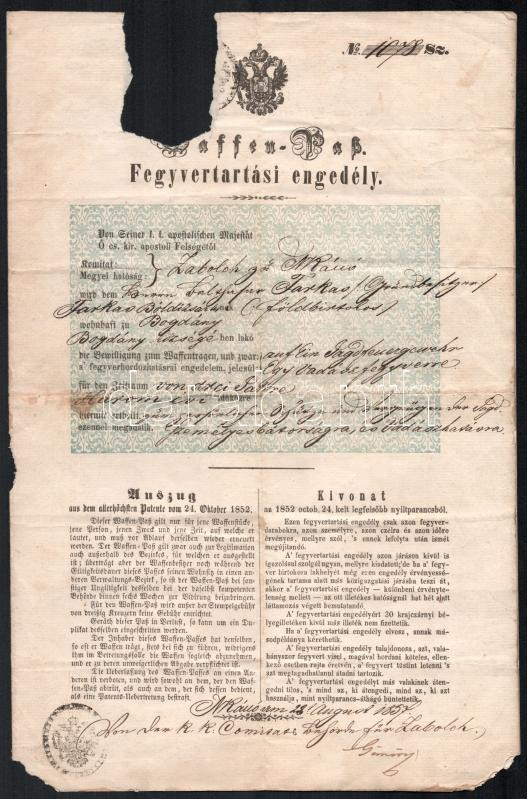 1857 Nagykálló, fegyvertartási engedély Farkas Boldizsár bogdányi lakos részére (,,személyes bátorságra, és vadászhatásra"), rajta Gömöry Pál (1815-1884), Szabolcs vármegye megyefőnökének aláírásával. A lap tetején hiánnyal. / 1857 Waffen-Pass (gun licence), damaged