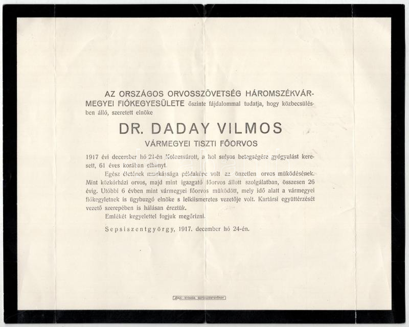 1917 Dárday Vilmos, háromszékvármegyei tisztifőorvos halálozási értesí... https://www.darabanth.com/de/460-Fernauktion/460.0/Kunst-Dokumente-andere-Sammelgebiete/Drucksachen~1000016/1917-Darday-Vilmos-haromszekvarmegyei-tisztifoorvos-halalozasi-ertesitoje~II3087687