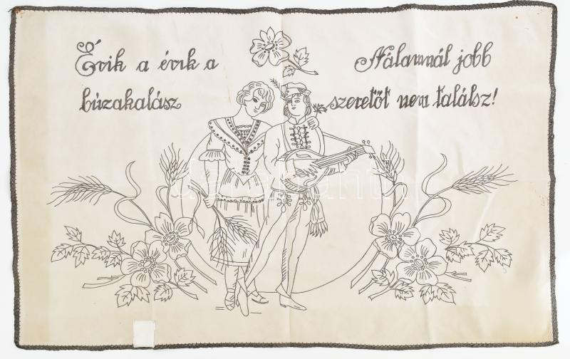 Beschreibung: Antik feliratos falvédő, "Érik a érik a búzakalász, nálamnál jobb szeretőt nem találsz" felirattal. Javítással, folttal, 90x60 cm
