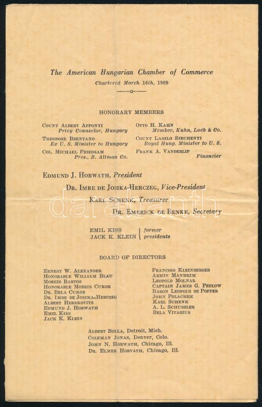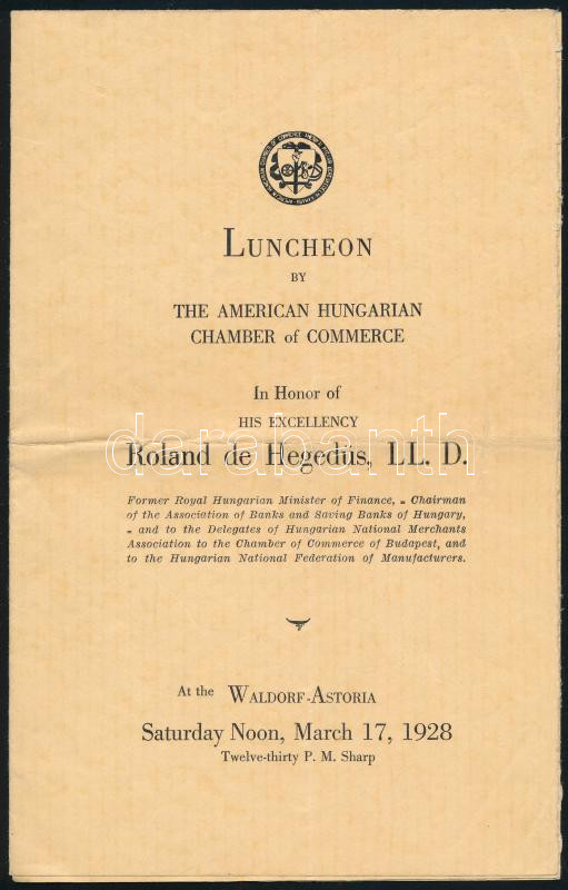 1928 Az Amerikai Magyar Kereskedelmi Kamara Hegedűs Lóránt tiszteletére rendezett ebédjének (Luncheon by The American Hungarian Chamber of Commerce) menükártyája, Hegedűs Lóránt (1872-1943) gazdaságpolitikus, író, egykori pénzügyminiszter és Sipőcz Jenő (1878-1937) Budapest főpolgármestere aláírásával. New-York, Waldorf Astoria, 1928. márc. 17. A díszebéd apropója, hogy 1928-ban az amerikai magyar közösség szobrot állított a városban Kossuth Lajosnak. Hajtott, egyébként jó állapotban.