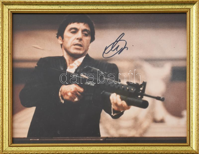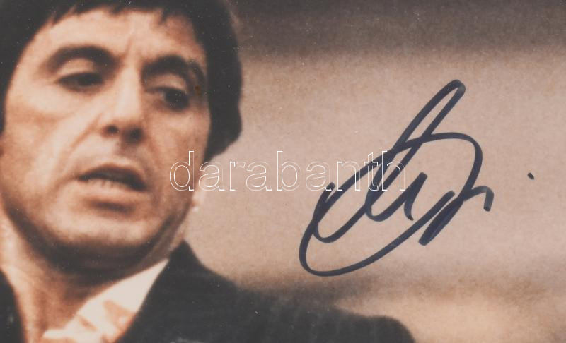Beschreibung: Al Pacino autográf aláírása A Scarface - A Sebhelyes arcú c. film őt ábrázoló filmrészleten. Üvegezett keretben, 22x28 cm
