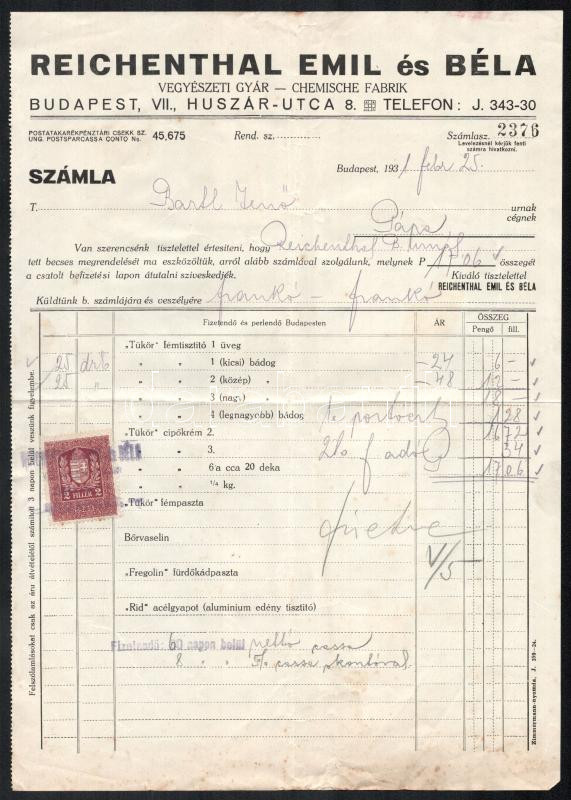 Beschreibung: 1931 Reichenthal Emil és Béla Vegyészeti Gyár "Tükör" cipőkrém / cipőpaszta / fémtisztító - fejléces számla