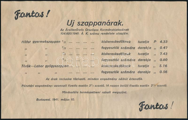 1941 Tájékoztató az Új szappanárak bevezetéséről az Árellenőrzés Orszá... https://www.darabanth.com/de/460-Fernauktion/460.0/Kunst-Dokumente-andere-Sammelgebiete/Werbungen~1000002/1941-Tajekoztato-az-Uj-szappanarak-bevezeteserol-az-Arellenorzes-Orszagos-Kormanybiztosanak~II3088538