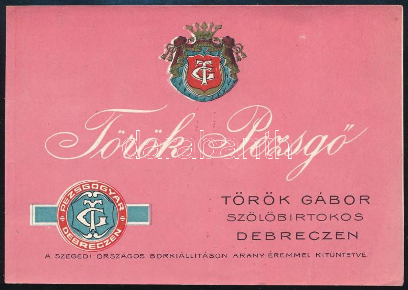 Török Pezsgő - Török Gábor Szőlőbirtokos Debrecen címke https://www.darabanth.com/de/460-Fernauktion/460.0/Kunst-Dokumente-andere-Sammelgebiete/Werbungen~1000002/Torok-Pezsgo-Torok-Gabor-Szolobirtokos-Debrecen-cimke~II3084554