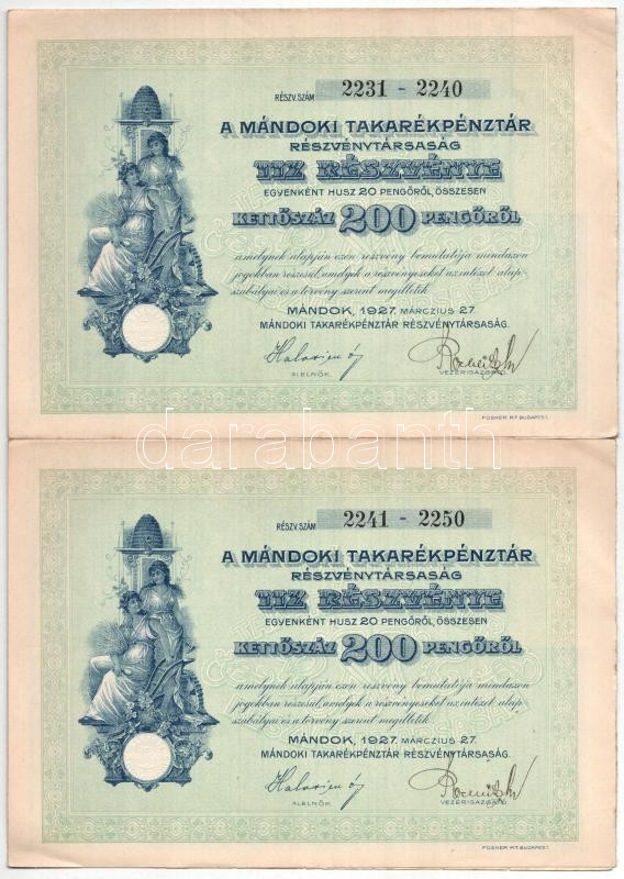 Mándok 1927. "Mándoki Takarékpénztár Részvénytársaság" tíz részvénye e... https://www.darabanth.com/de/460-Fernauktion/460.0/Numismatik/Aktien-und-Tickets~2000006/Mandok-1927-Mandoki-Takarekpenztar-Reszvenytarsasag-tiz-reszvenye-egyenkent-20P-rol-osszesen~II3084348
