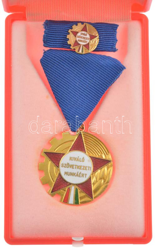 Beschreibung: ~1960. "Kiváló szövetkezeti munkáért" aranyozott, zománcozott kitüntetés mellszalagon szalagsávval, miniatűrrel, eredeti dobozban (38mm) T:1- repedt zománc díszdobozban