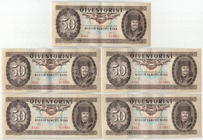 1980. 50Ft (5x) sorszámkövetők és egyugrású sorszámmal "D 080 024462 -... https://www.darabanth.com/de/460-Fernauktion/460.0/Numismatik/Ungarische-Banknoten~2000008/1980-50Ft-5x-sorszamkovetok-es-egyugrasu-sorszammal-D-080-024462-D-080-024467-T-F-mind-szep~II3081959