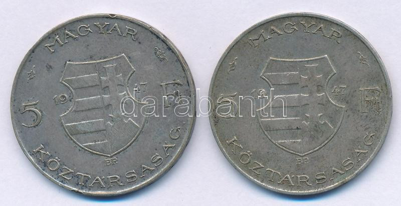 1947. 5Ft "Kossuth" Ag (2x) T:F patina Adamo F8.1 https://www.darabanth.com/de/460-Fernauktion/460.0/Numismatik/Ungarische-Munzen-und-Munzen-mit-ungarischem-Munzzeichen~2000009/1947-5Ft-Kossuth-Ag-2x-TF-patina-Adamo-F81~II3086926