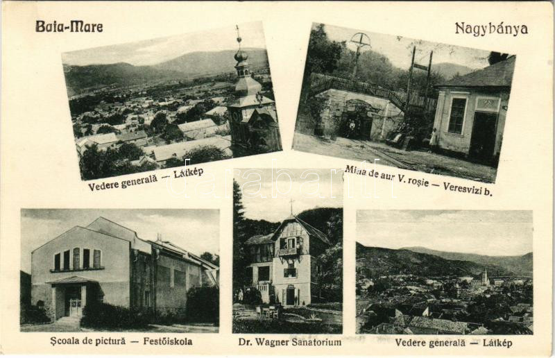 Nagybánya, Baia Mare; látkép, festőiskola, veresvizi aranybánya bejára... https://www.darabanth.com/de/461-Fernauktion/461.0/Ansichtskarten/Siebenburgen~1000002/Nagybanya-Baia-Mare-latkep-festoiskola-veresvizi-aranybanya-bejarata-Dr-Wagner-szanatorium-~II3094822