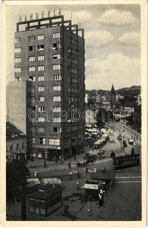 1939 Pozsony, Pressburg, Bratislava; Námestie / tér, villamos, Grand Cafe kávéház, Manderla szálloda, piac, optikus / square, tram, cafe, hotel, market, optician + "Andrej Hlinku" + "Stefánikove Oslavy" So. Stpl