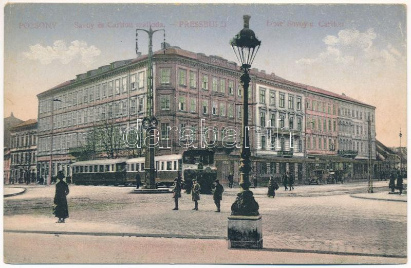 Pozsony, Pressburg, Bratislava; Savoy és Carlton szálloda, Pozsony-Béc... https://www.darabanth.com/de/461-Fernauktion/461.0/Ansichtskarten/Slowakei~1000105/Pozsony-Pressburg-Bratislava-Savoy-es-Carlton-szalloda-Pozsony-Becs-villamos-vasut-varosi~II3095112
