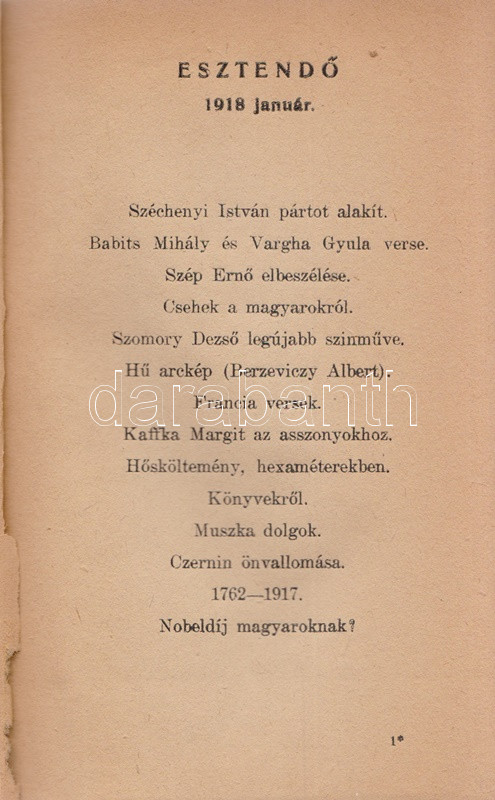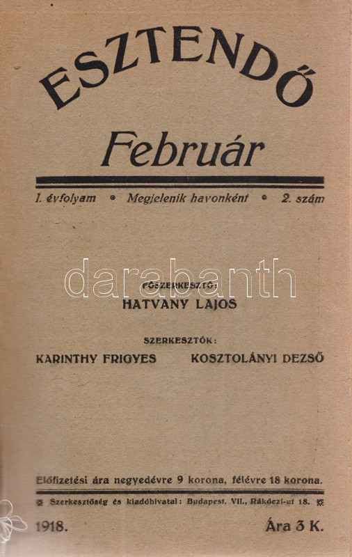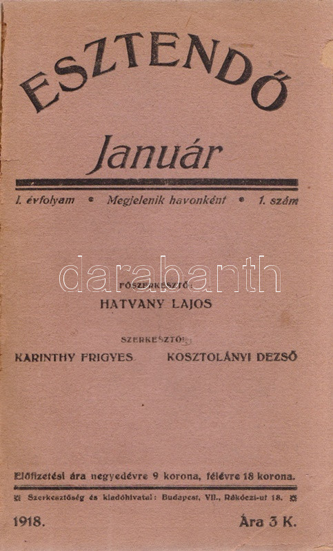 Esztendő. (Szépirodalmi folyóirat.) Főszerkesztő: Hatvany Lajos, szerkesztők: Karinthy Frigyes és Kosztolányi Dezső. Megjelenik havonta. I. évfolyam, 1-2. szám. (1918 január-február.) [Egybekötve.] Budapest, 1918. A Pesti Napló kiadása (Pallas Rt. ny.) 191 + [1] p.; 157 + [3] p. szkennelve, átméretezve. Az Esztendő havi szépirodalmi folyóirat 1918 januárja és 1919 februárja között jelent meg. A lap programja szerint a régi és az új (szerzők) jó irodalmának ad helyet, legfontosabb szerzői: Somlyó Zoltán, Karinthy Frigyes, Kosztolányi Dezső, Babits Mihály, Krúdy Gyula, Szép Ernő, Barta Lajos, Gábor Andor, Kaffka Margit, Lengyel Menyhért, Harsányi Zsolt, Havas Gyula és a Nyugatból lassan kiszoruló Juhász Gyula. Versek, elbeszélések és egyfelvonásosok váltakoznak az első két számban, a Hatvany Lajos politikai ízléséhez közel álló politikai cikkekkel. Példányunkból egy levél és a második szám eredeti borítója kijár, az eredeti hátsó borítókon képes hirdetések. Lakatos 364. Aranyozott gerincű korabeli félvászon kötésben, az eredeti folyóiratborítók bekötve. Jó példány.