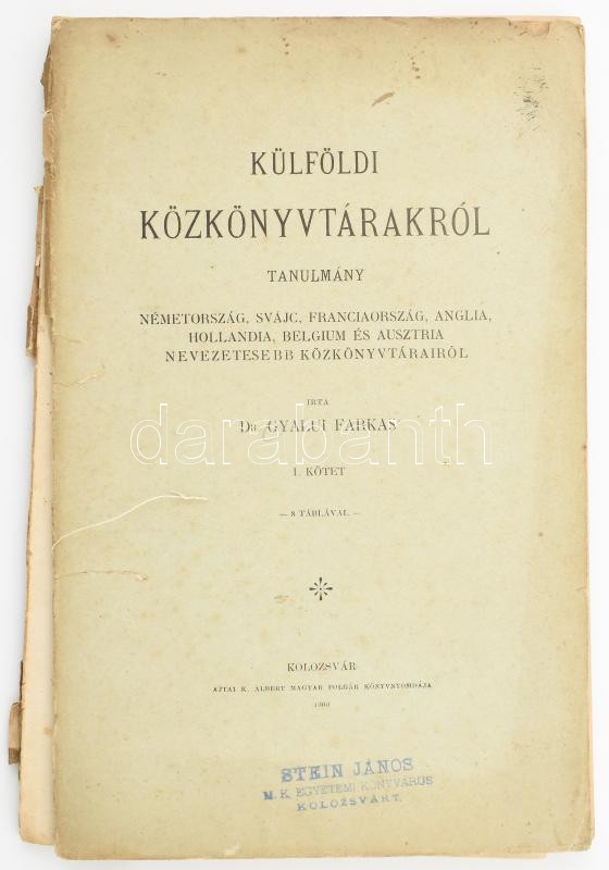 Gyalui Farkas: Külföldi közkönyvtárakról. Tanulmány Németország, Svájc, Franciaország, Anglia... Ausztria nevezetesebb közkönyvtárairól. I. kötet. [Unicus]