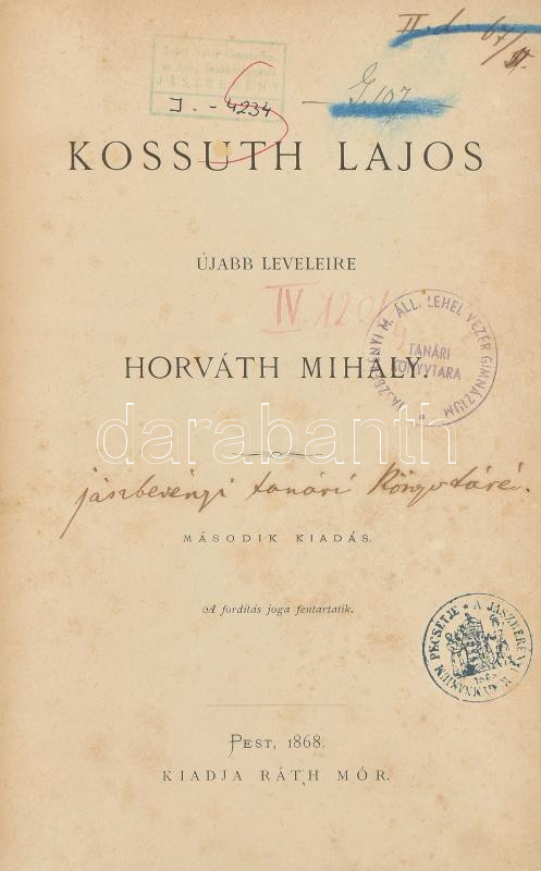 Horváth Mihály: Kossuth Lajos újabb leveleire. Pest, 1868, Ráth Mór. M... https://www.darabanth.com/de/461-Fernauktion/461.0/Bucher/Bucher-Geschichte~2000040/Horvath-Mihaly-Kossuth-Lajos-ujabb-leveleire-Pest-1868-Rath-Mor-Masodik-kiadas-Felvaszon~II3096006