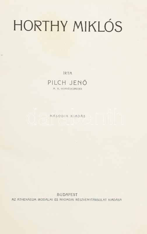 Pilch Jenő: Horthy Miklós. Bp., 1929., Athenaeum, 1 t. (Nagybányai vitéz Horthy Miklós kormányzó színes portréja, hártyapapírral védett színes címkép) t. + 408 p. + 6 (közte egy színes) t. + 2 (hasonmások, ebből az egyik feliratozott hártyapapírral) t. + 1 (kétoldalas térkép) t. Második kiadás. Kiadói aranyozott félbőr-kötés, az elülső táblán Horthy-család aranyozott, dombornyomott címerével. Sérült gerinccel