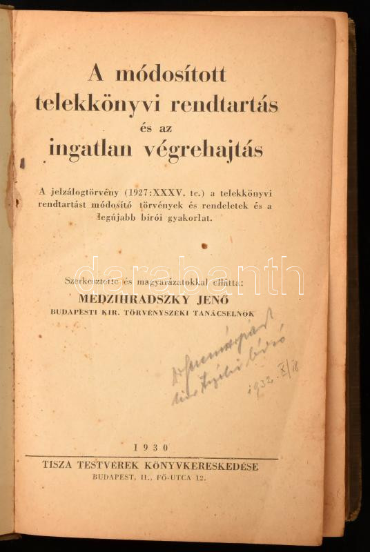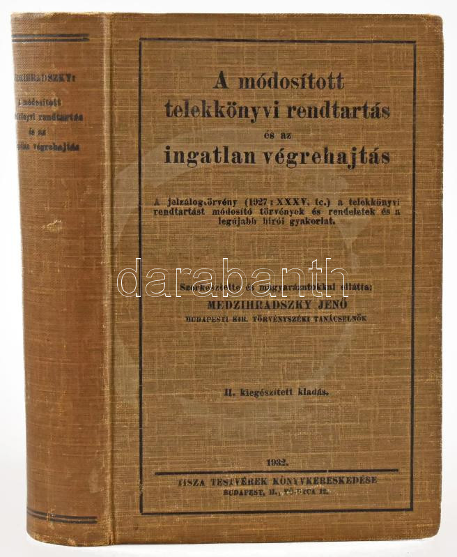 Medzihradszky Jenő: A módosított telekkönyvi rendtartás és az ingatlan végrehajtás. Szerk. és magyarázatokkal ellátta: - - . Bp., 1932, Tisza Testvérek Könyvkereskedése (Fővárosi-ny.), 804 p. Második, kiegészített kiadás. Kiadói egészvászon-kötés, a borítón némi kopással, korabeli tulajdonosi névbejegyzéssel (Dr. Ferencz Árpád kir. tszéki bíró).