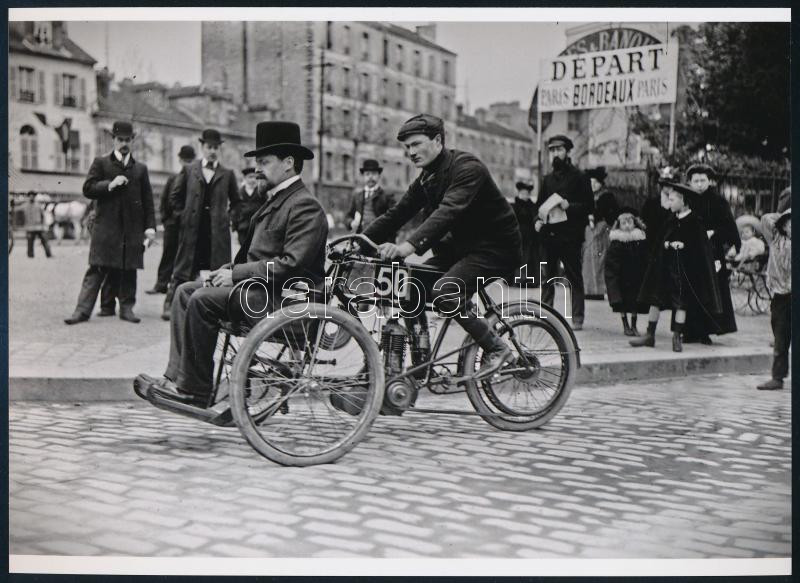 cca 1910 Párizs, motoros tricikli, a személyszállítás egyik új eszköze, a néhai Auto és Motorújság (1922-1938) című lap archívumából 1 db modern nagyítás jelzés nélkül, 15x21 cm