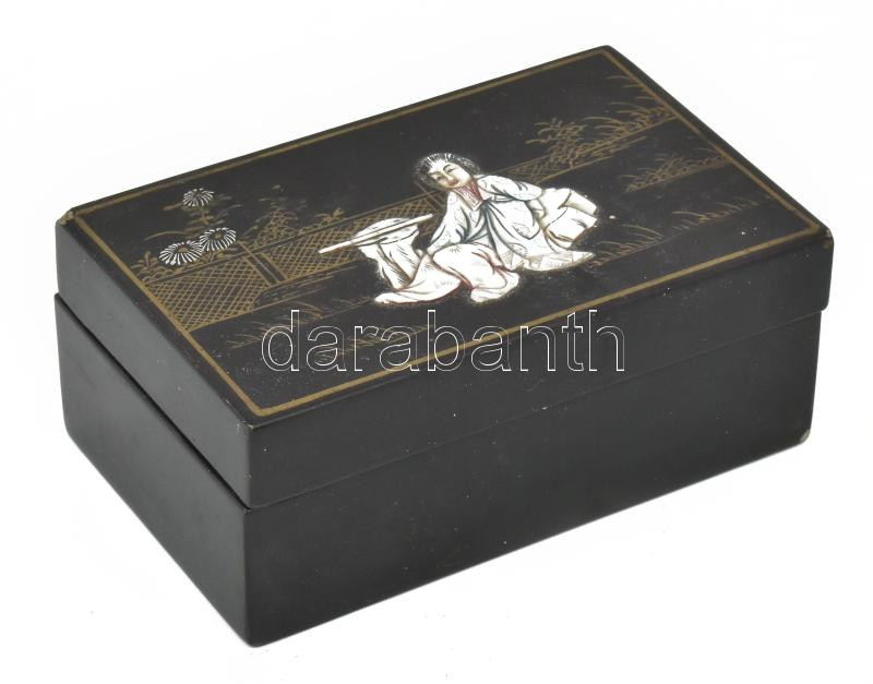 Beschreibung: Ékszeres doboz, japonizáló mintával, lakkozott fa, gyöngyház berakással, sarkán kis kopás 13x8,5x6 cm