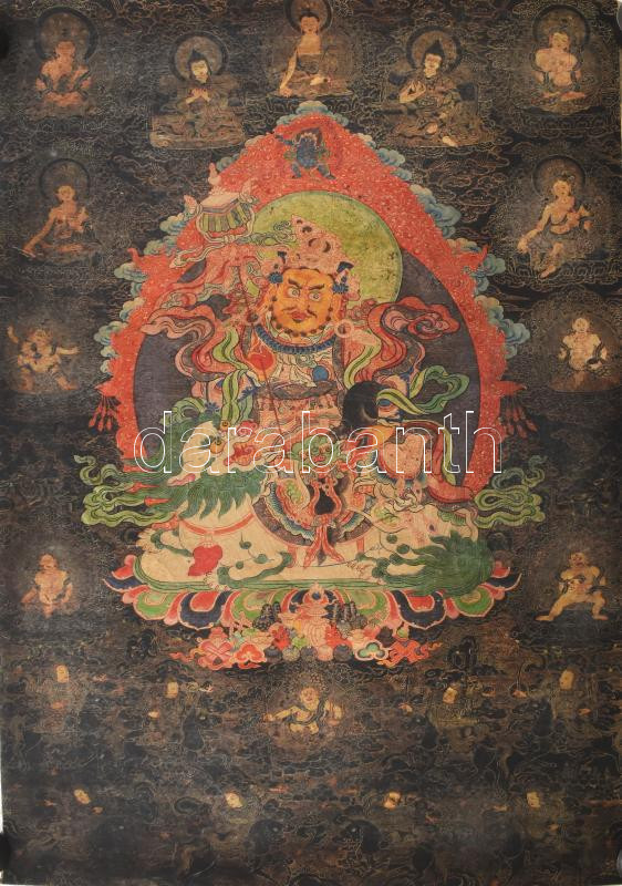 Thangka, Jambhala ábrázolással. Tibet vagy Kína, XX. sz. első fele, nyomat, vászon. 89x58 cm, korának megfelelő állapotban, hátulján kopott, foltos, feltekerve.