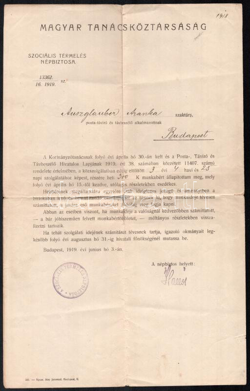 1918-1919 A Magyar Népköztársaság, ill. a Magyar Tanácsköztársaság idején kiállított kinevezési / besorolási okiratok (2 db), mindkettő Auszglauber Aranka névre, Hollós József posta- és távirda vezérigazgató bélyegzett aláírásával