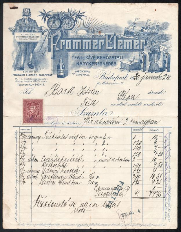 1930 Frommer Elemér Tea és Kávébehozatali Nagykereskedés dekoratív fejléces számla, Teakészlet 0,1,2,3 - Császárkeverék, Rotschild, Udvari keverék, Gentlemen, Ladys blend tea tárgyában, kézzel írott