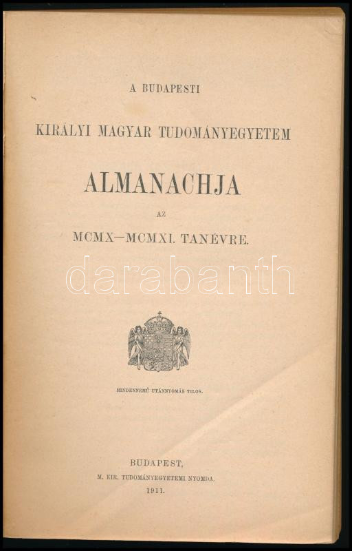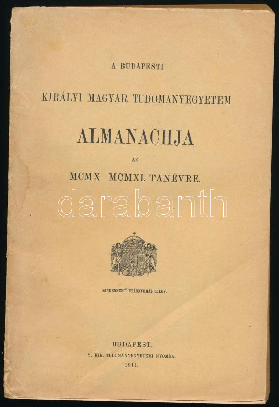 1911 A Budapesti Királyi Magyar Tudományegyetem Almanachja az MCMX-MCM... https://www.darabanth.com/de/461-Fernauktion/461.0/Kunst-Dokumente-andere-Sammelgebiete/Drucksachen~2000015/1911-A-Budapesti-Kiralyi-Magyar-Tudomanyegyetem-Almanachja-az-MCMX-MCMXI-tanevere-Bp-1911-M~II3099644