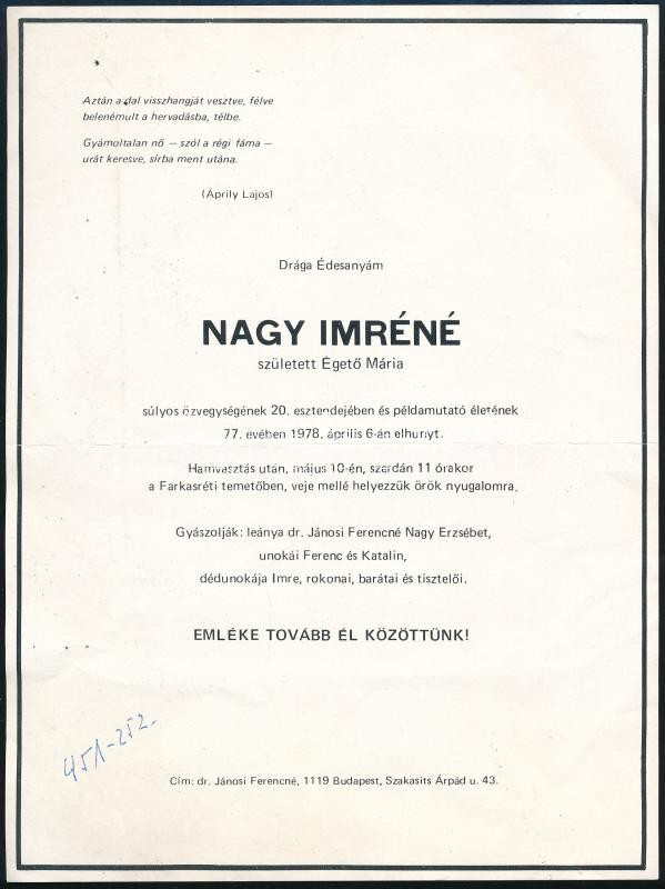 1978 Nagy Imréné szül. Égető Mária, Nagy Imre (1896-1958) politikus fe... https://www.darabanth.com/de/461-Fernauktion/461.0/Kunst-Dokumente-andere-Sammelgebiete/Drucksachen~2000015/1978-Nagy-Imrene-szul-Egeto-Maria-Nagy-Imre-1896-1958-politikus-felesegenek-halalozasi~II3096776