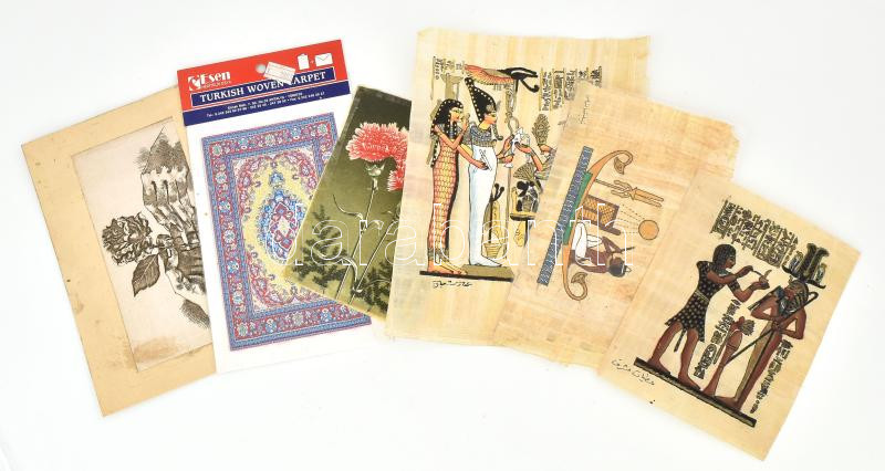 Beschreibung: Egyiptomi papiruszképek, szövetkép, mini török szőnyeg, stb., össz. 6 db, változó méretben és állapotban